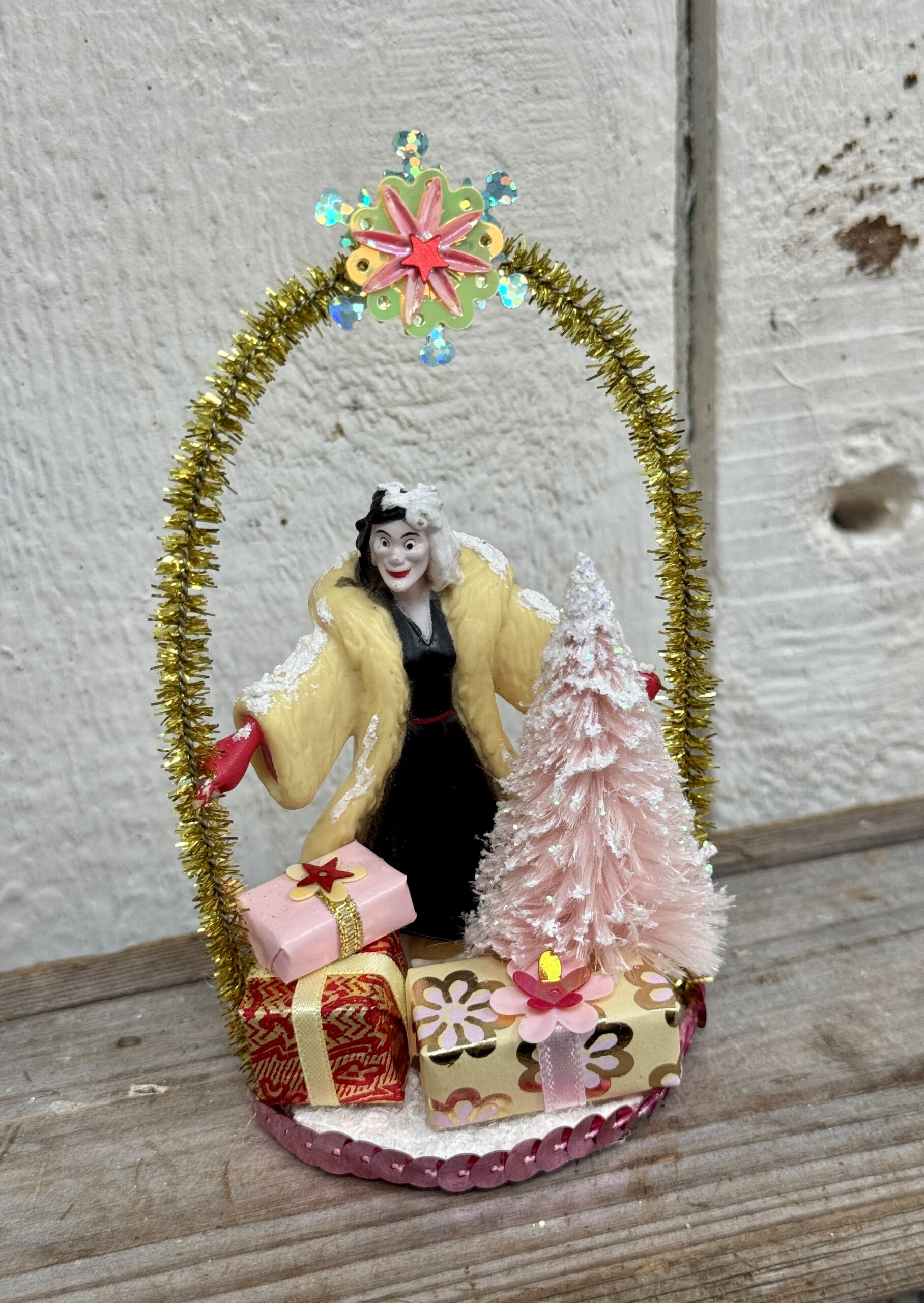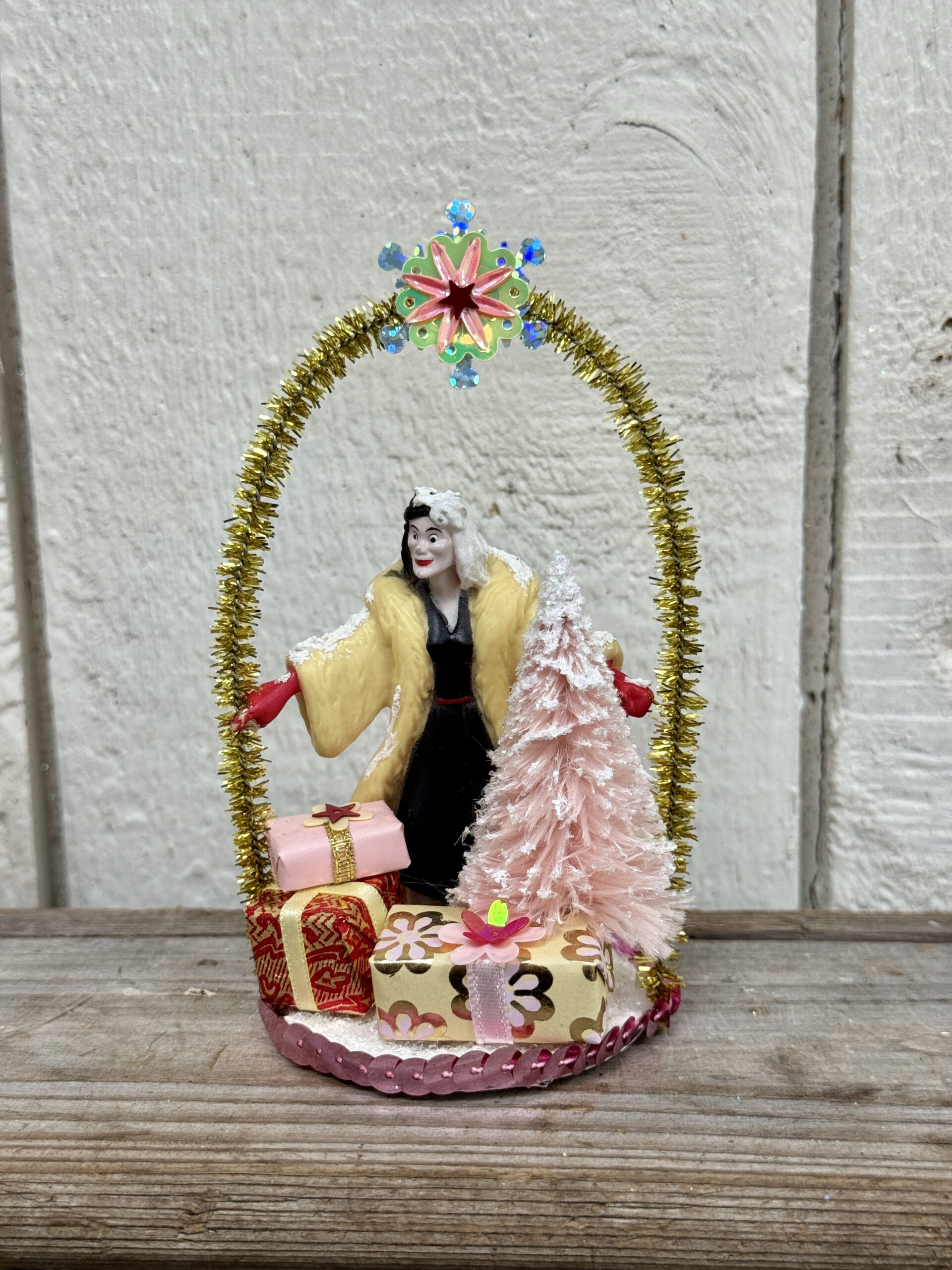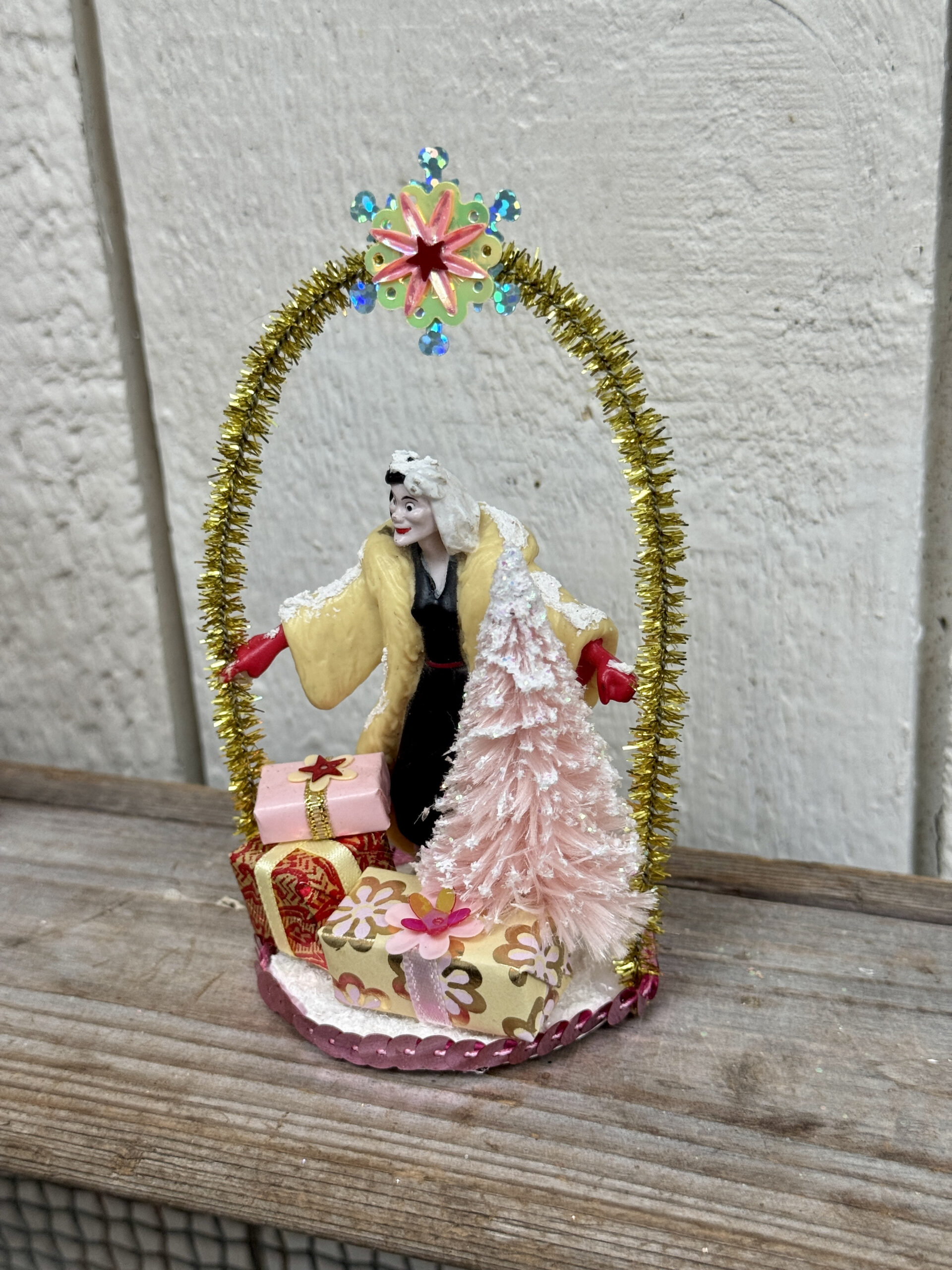Det hele er bygget op på en lille plade, dekoreret med sne og glimmer, og der er påsat piberenser med pailletter. Gaverne er skåret og pakket ind i mønstret papir og pyntet med små pailletter på toppen. Og juletræet er klippet, malet og glimret.
