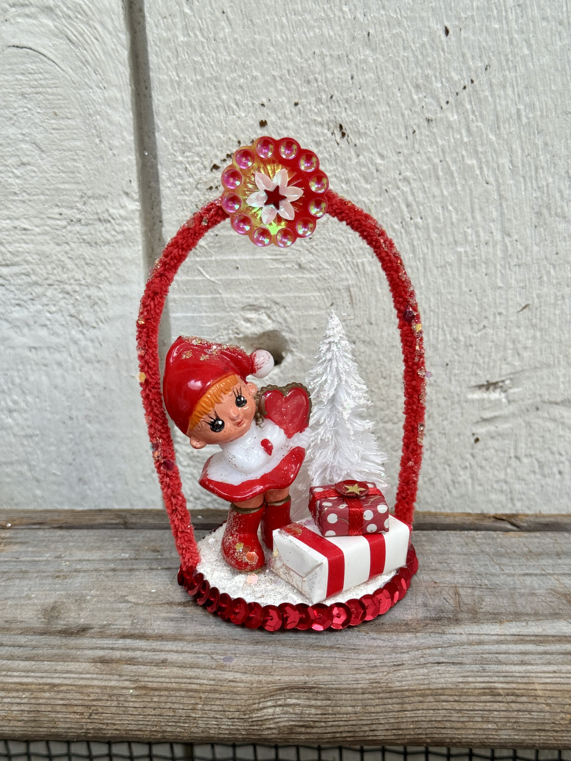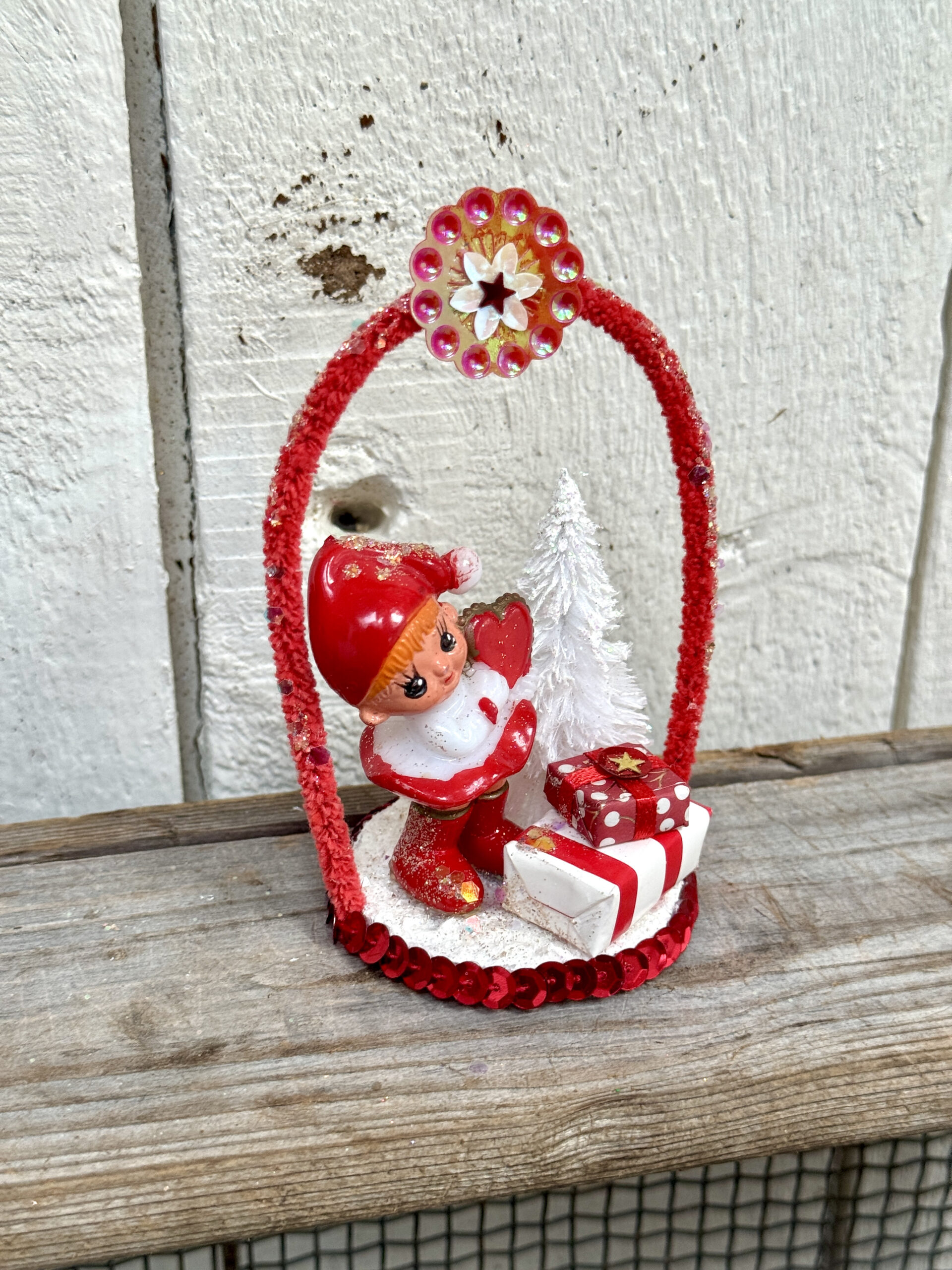 Det hele er bygget op på en lille plade, dekoreret med sne og glimmer, og der er påsat piberenser med pailletter. Gaverne er skåret og pakket ind i mønstret papir og pyntet med små pailletter på toppen. Og juletræet er klippet, malet og glimret.