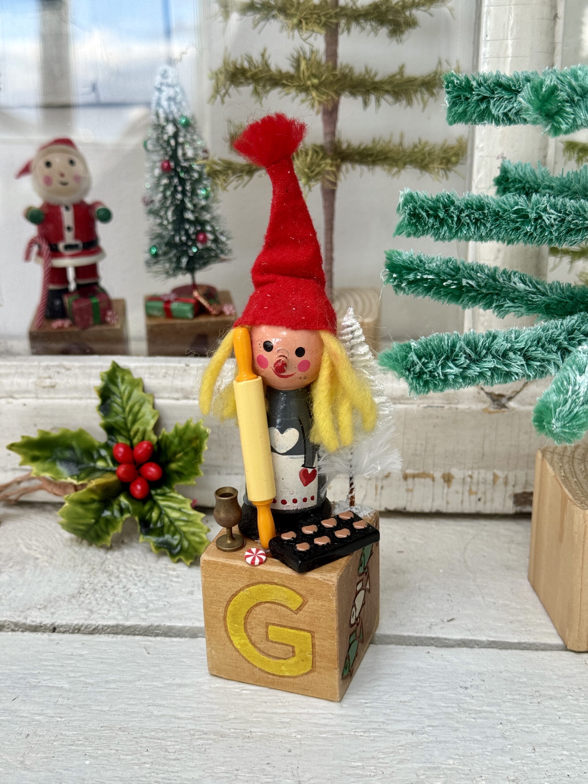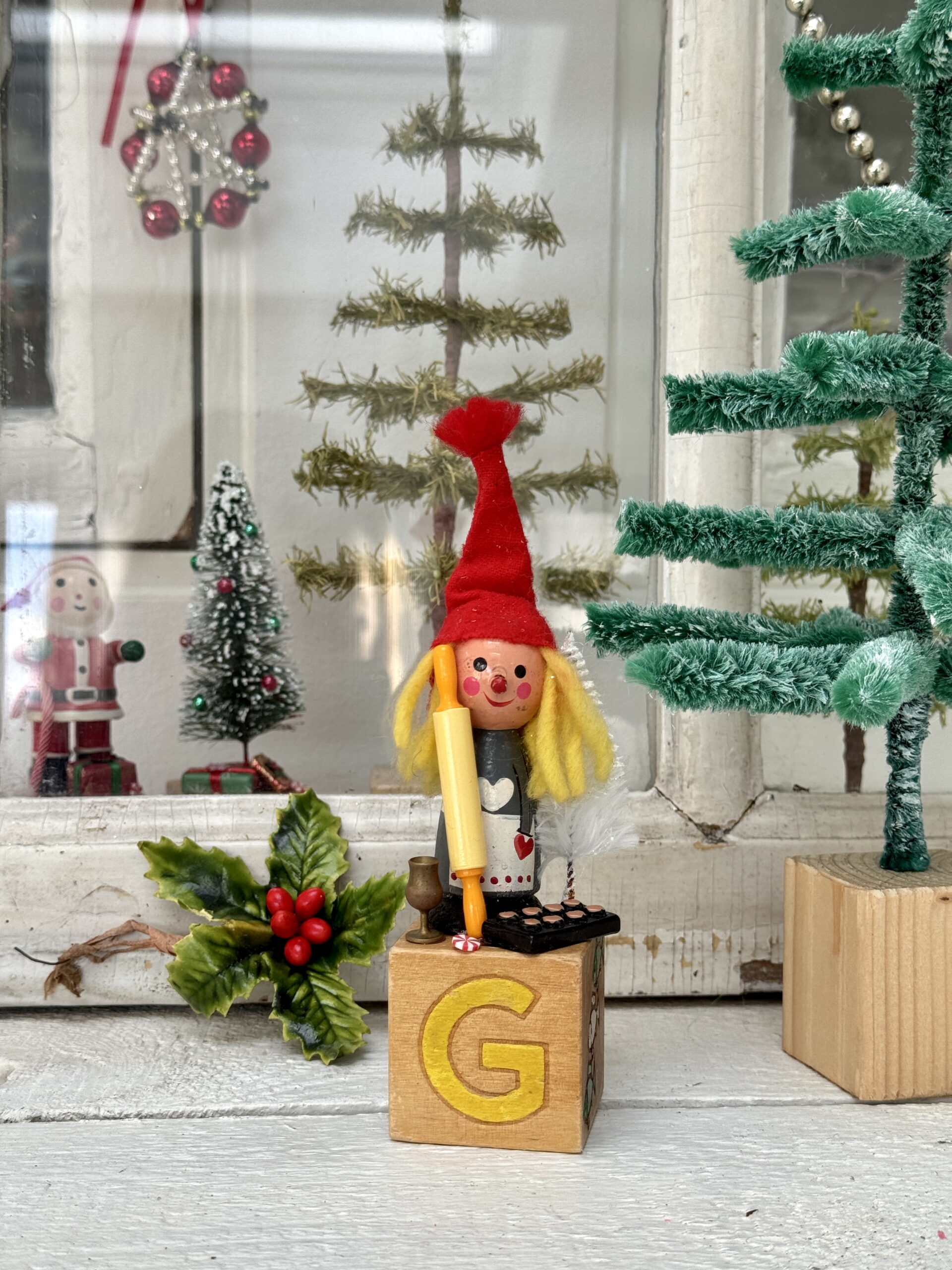 Dekorationen er bygget op på en gammel legeklods. Den er pyntet med julepynt og legetøj fra genbrug sammen med et lille håndlavet juletræ.