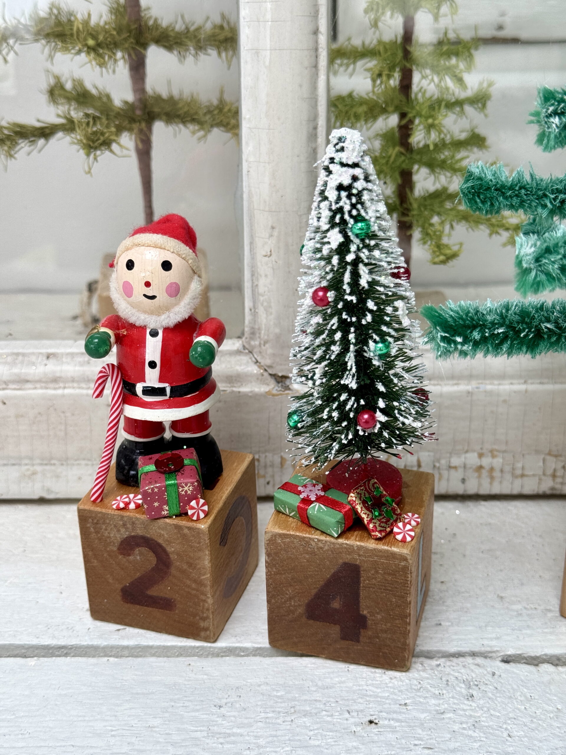 Sættet består af 2 gamle legeklodser, pyntet med gammel julepynt fra genbrug og håndlavede miniature gaver, slikstok, peppermynteslik og et julepyntet juletræ.
