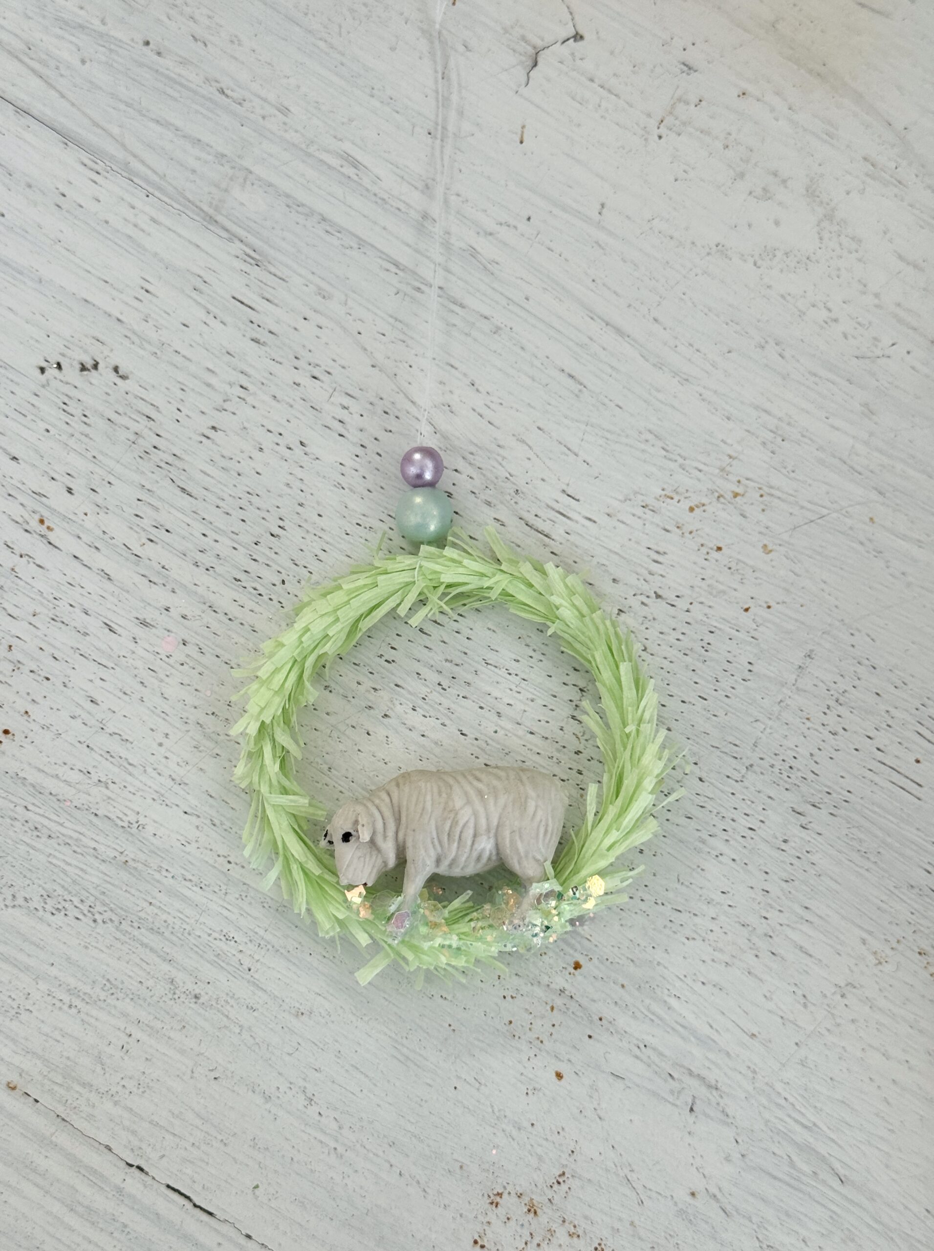 Lille ophæng af crepepapir med miniature får fra genbrug indeni.