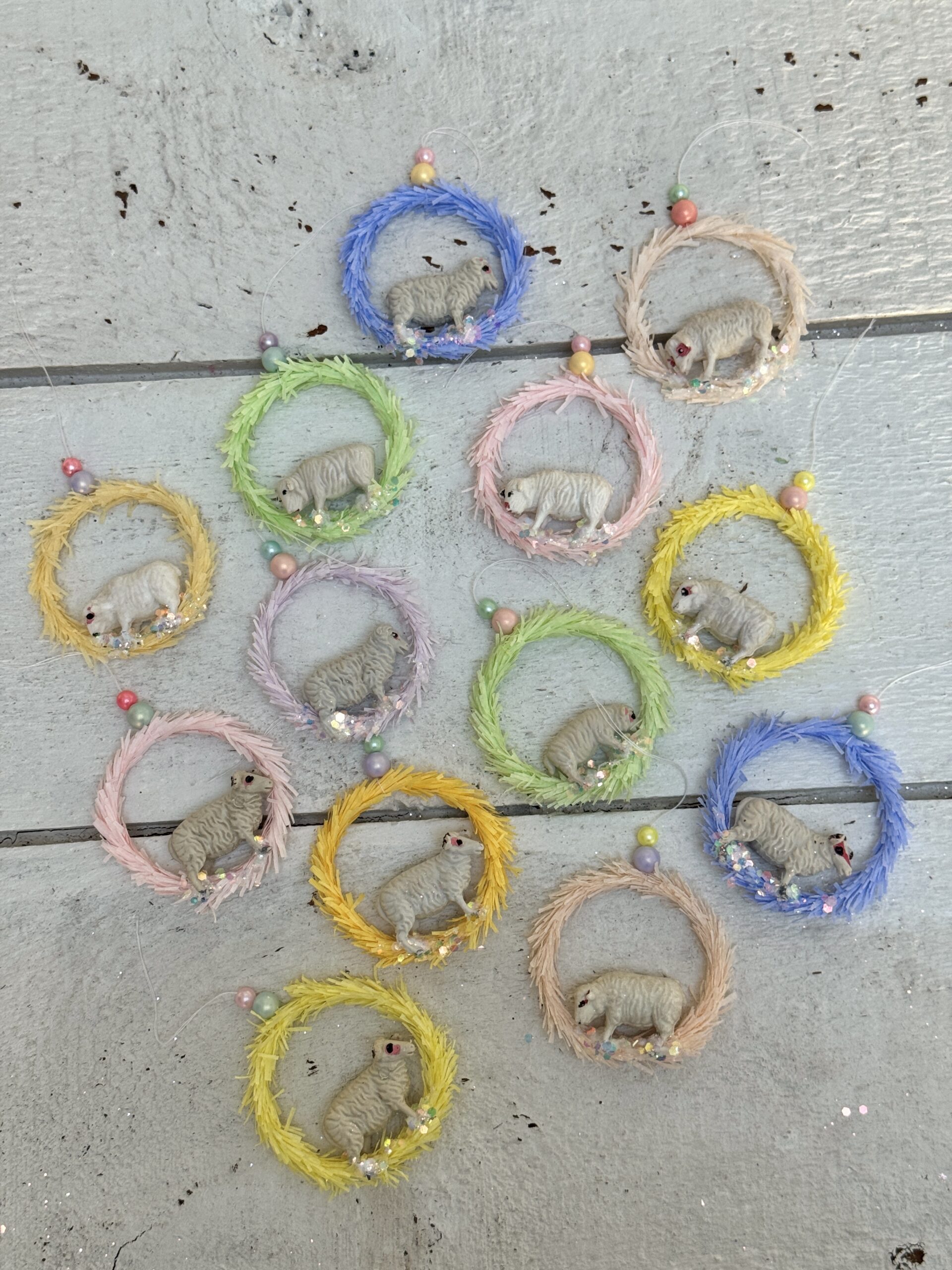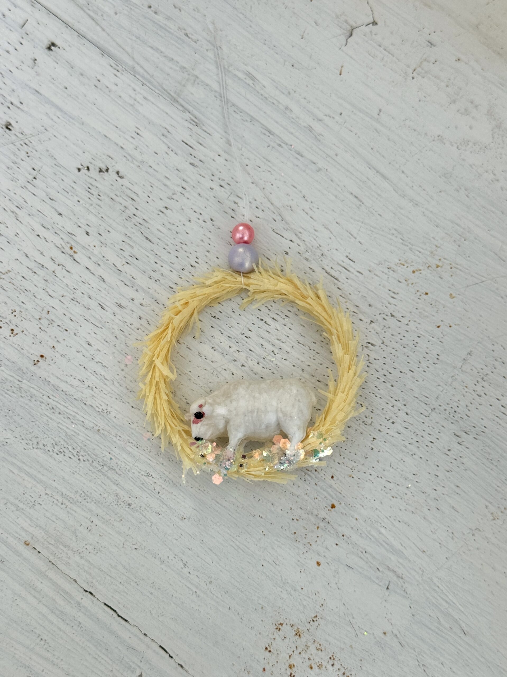 Lille ophæng af crepepapir med miniature får fra genbrug indeni.