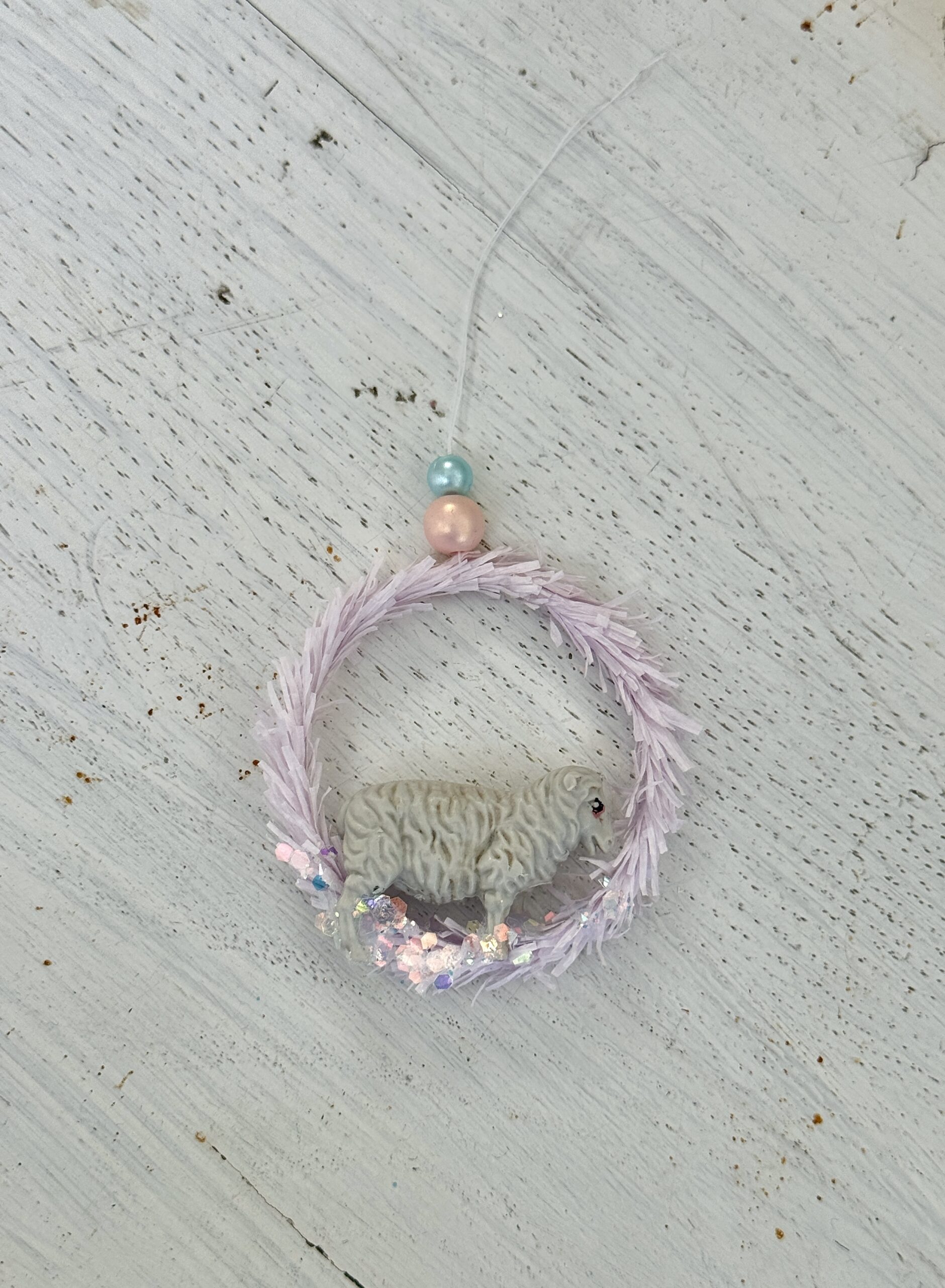 Lille ophæng af crepepapir med miniature får fra genbrug indeni.