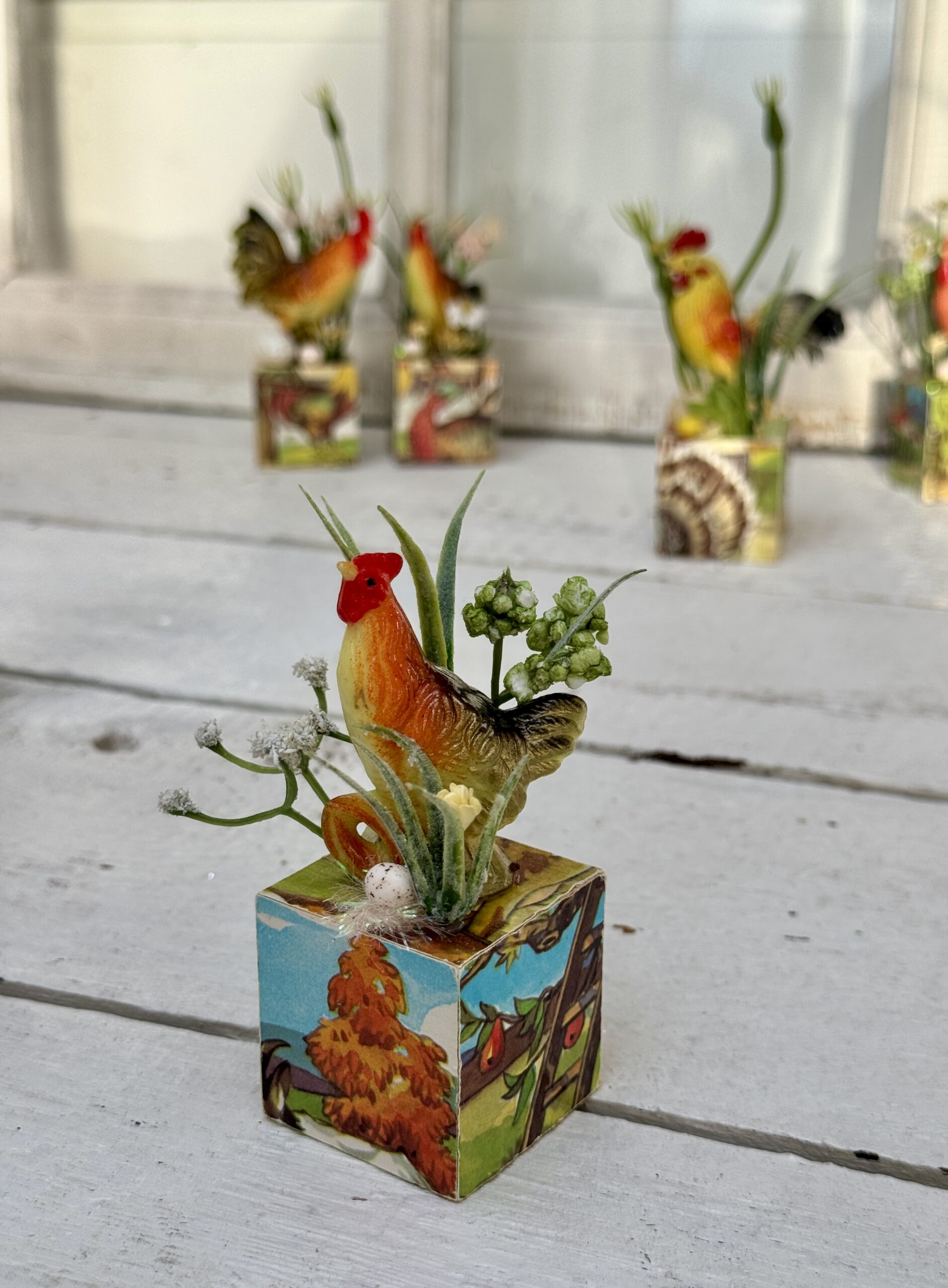 ovenpå er der dekoreret med en legetøjshøne (også fundet i genbrug) små kunstige planter og blomster.