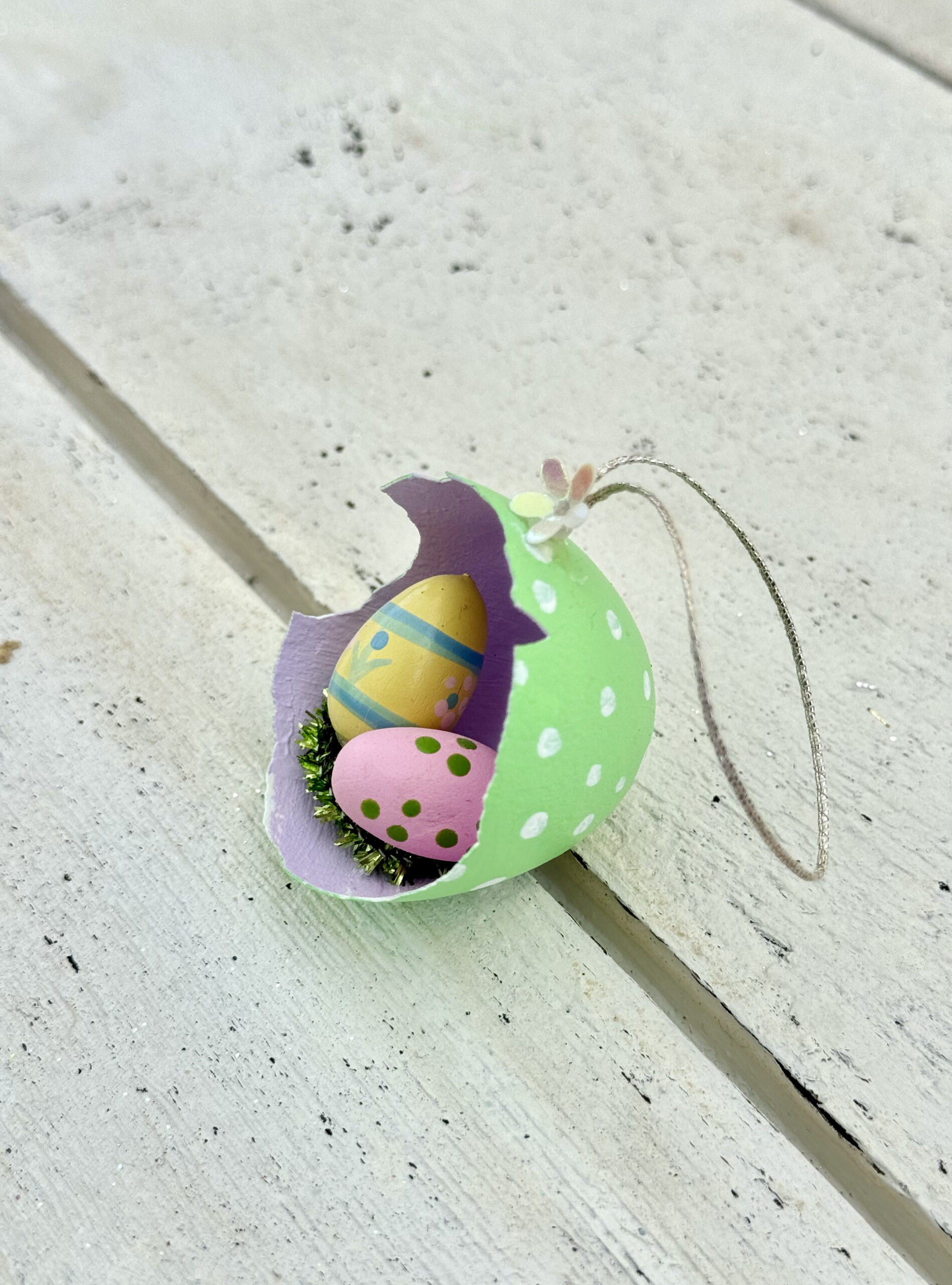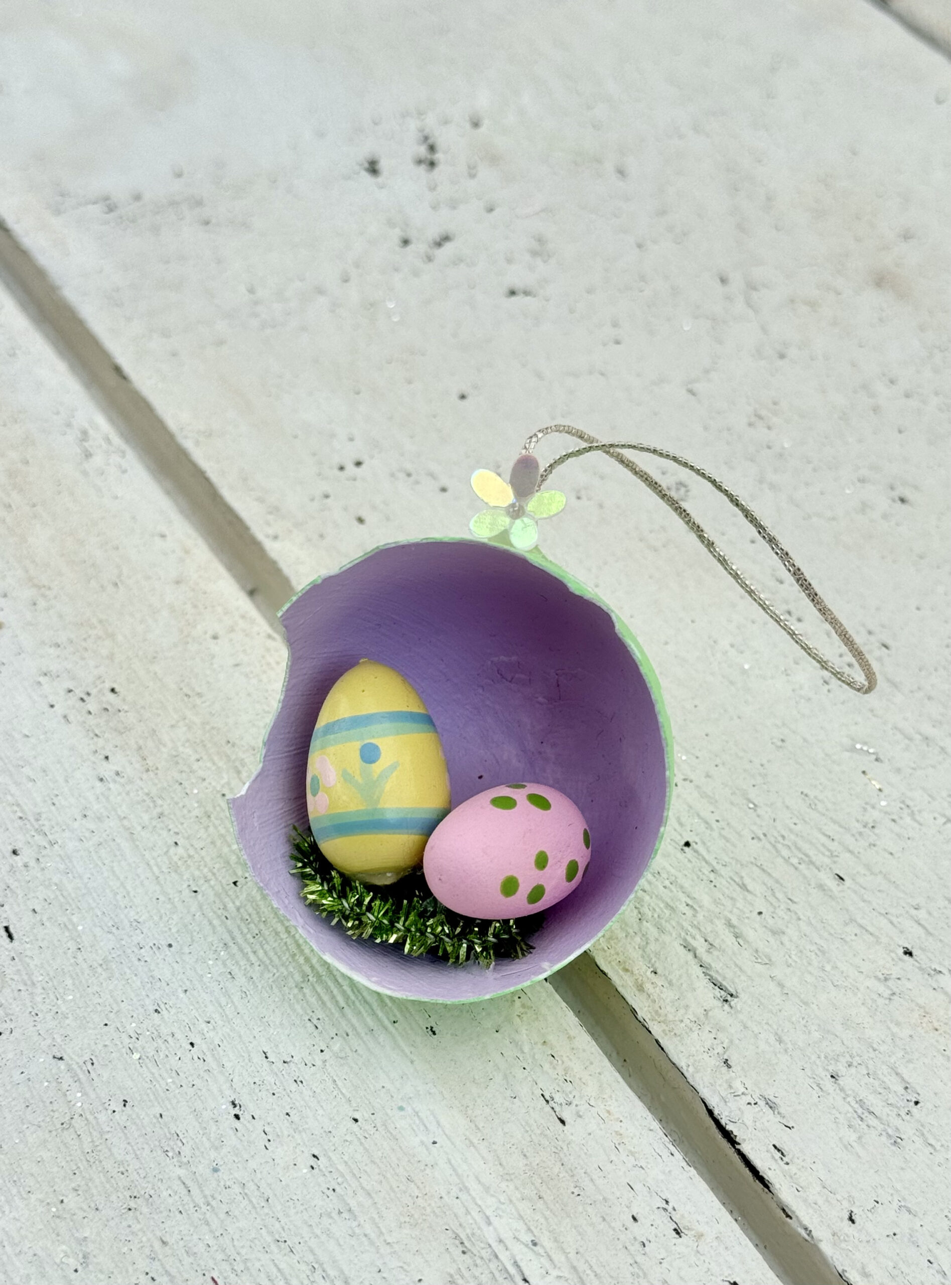 Påskeophæng lavet af en ægte æggeskal, der er renset og dekoreret med maling, glimmer og miniature ting.