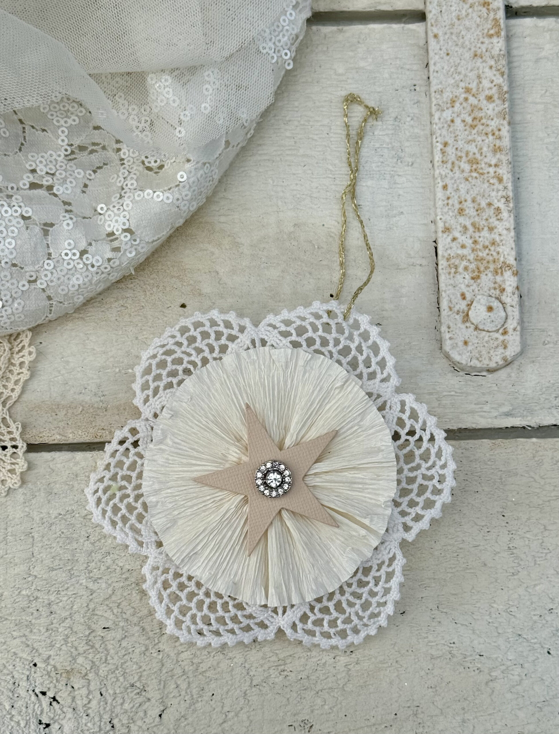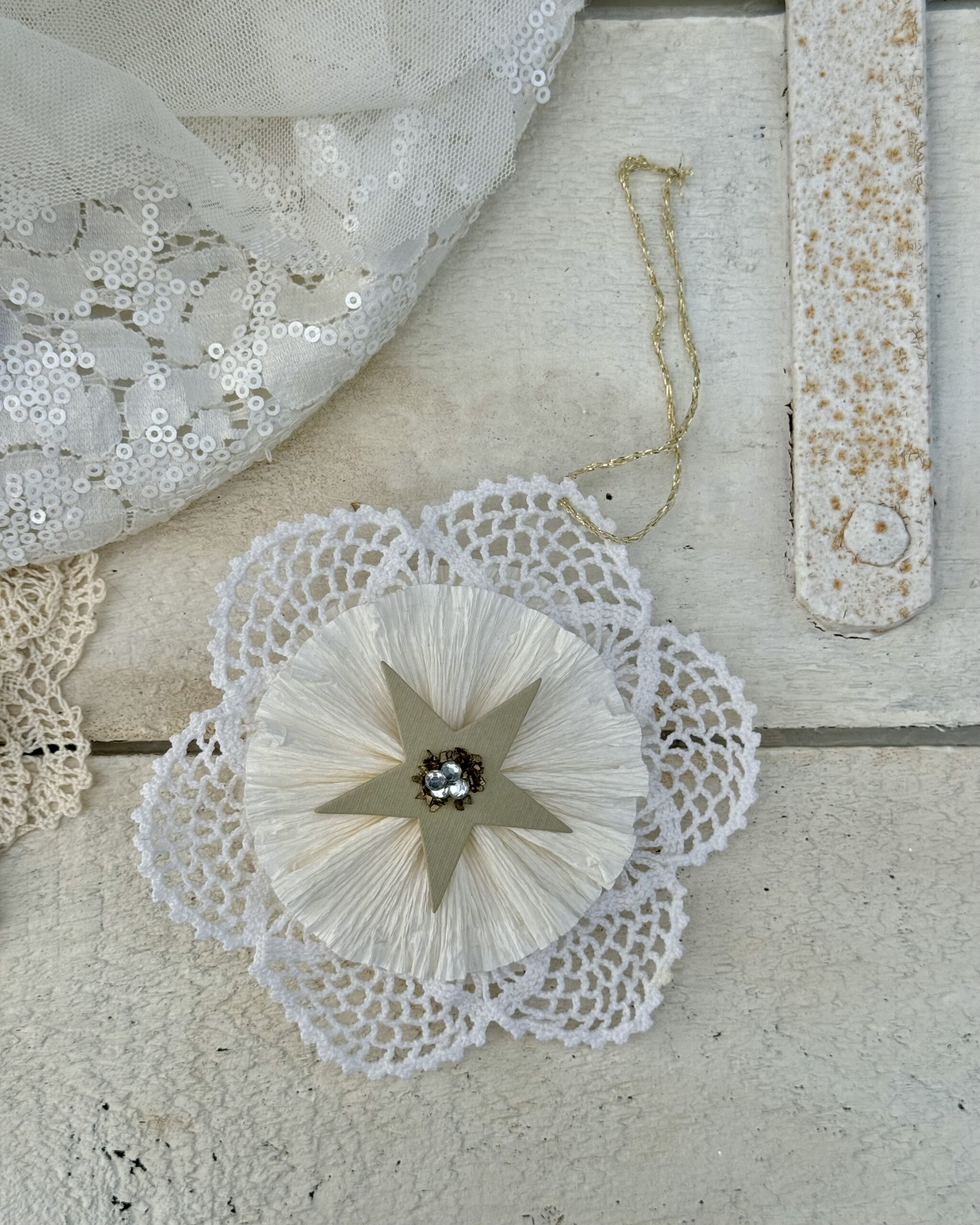 Rosette af en gammel flakon, og dekoreret med kartonstjerner, ørering og glimmer på begge sider.