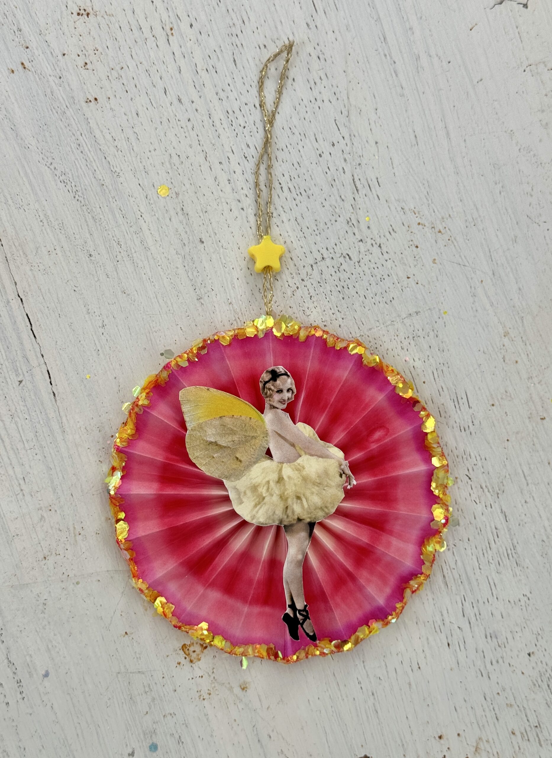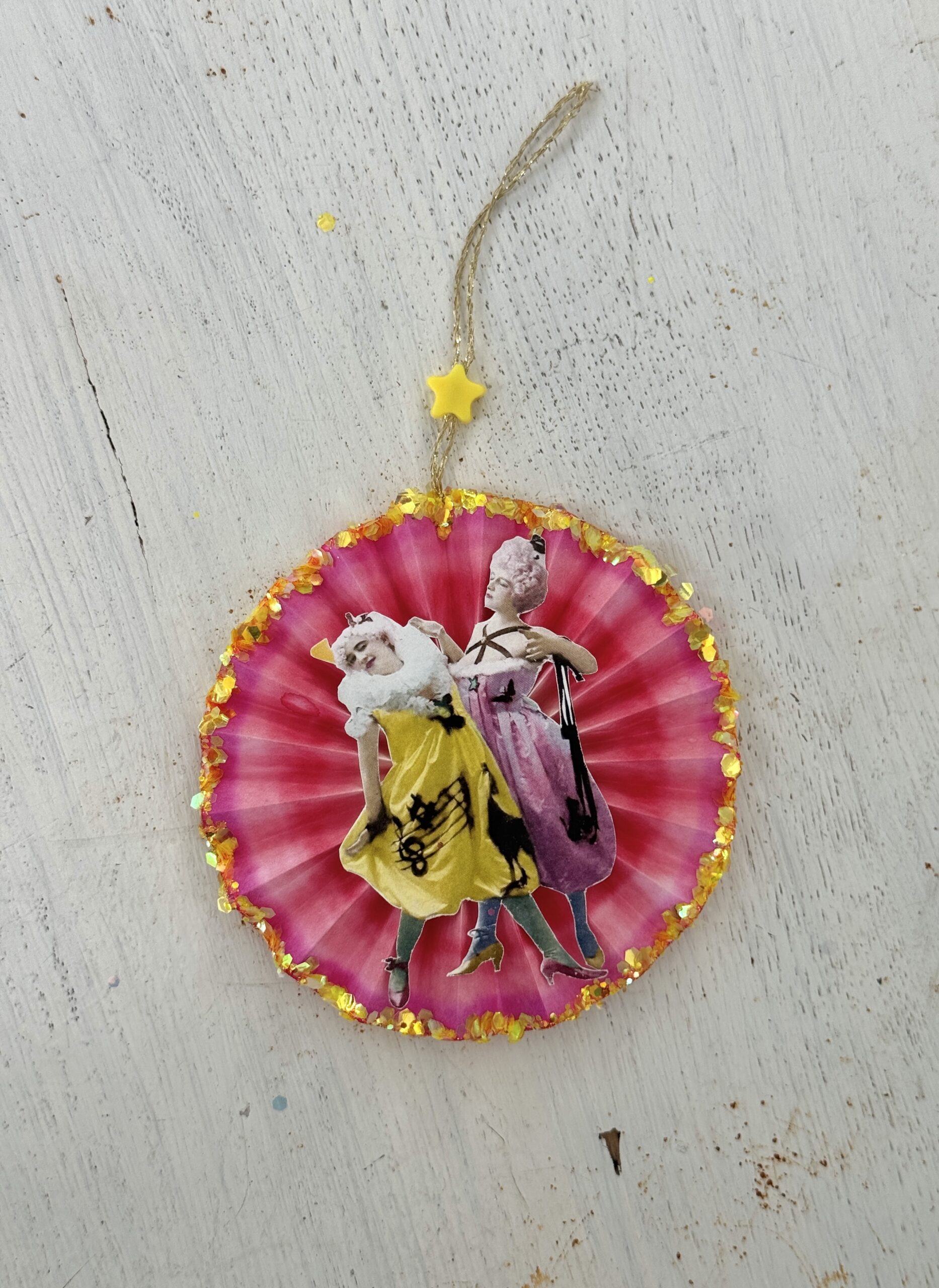 Håndlavet rosette af malet papir og med glansbilleder på begge sider.