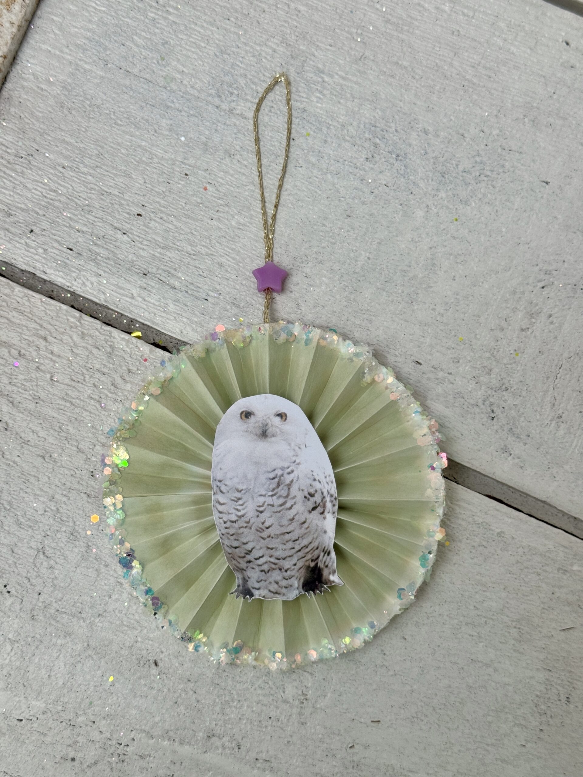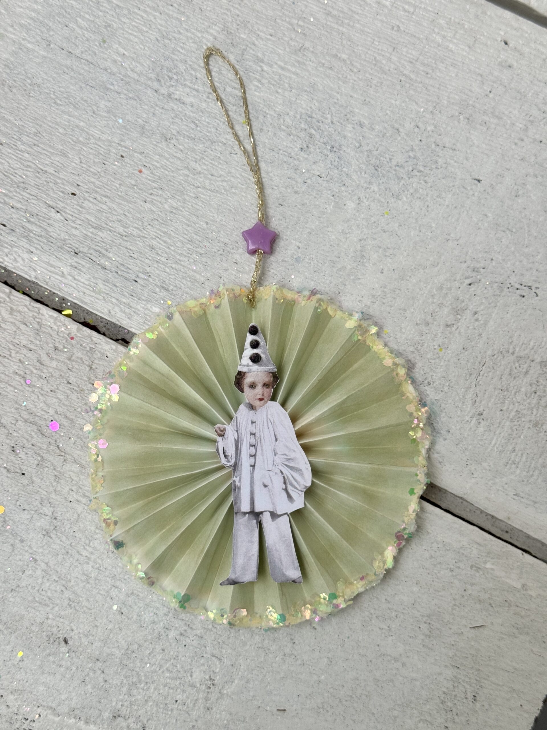 Håndlavet rosette af malet papir og med kitsch billeder på begge sider.