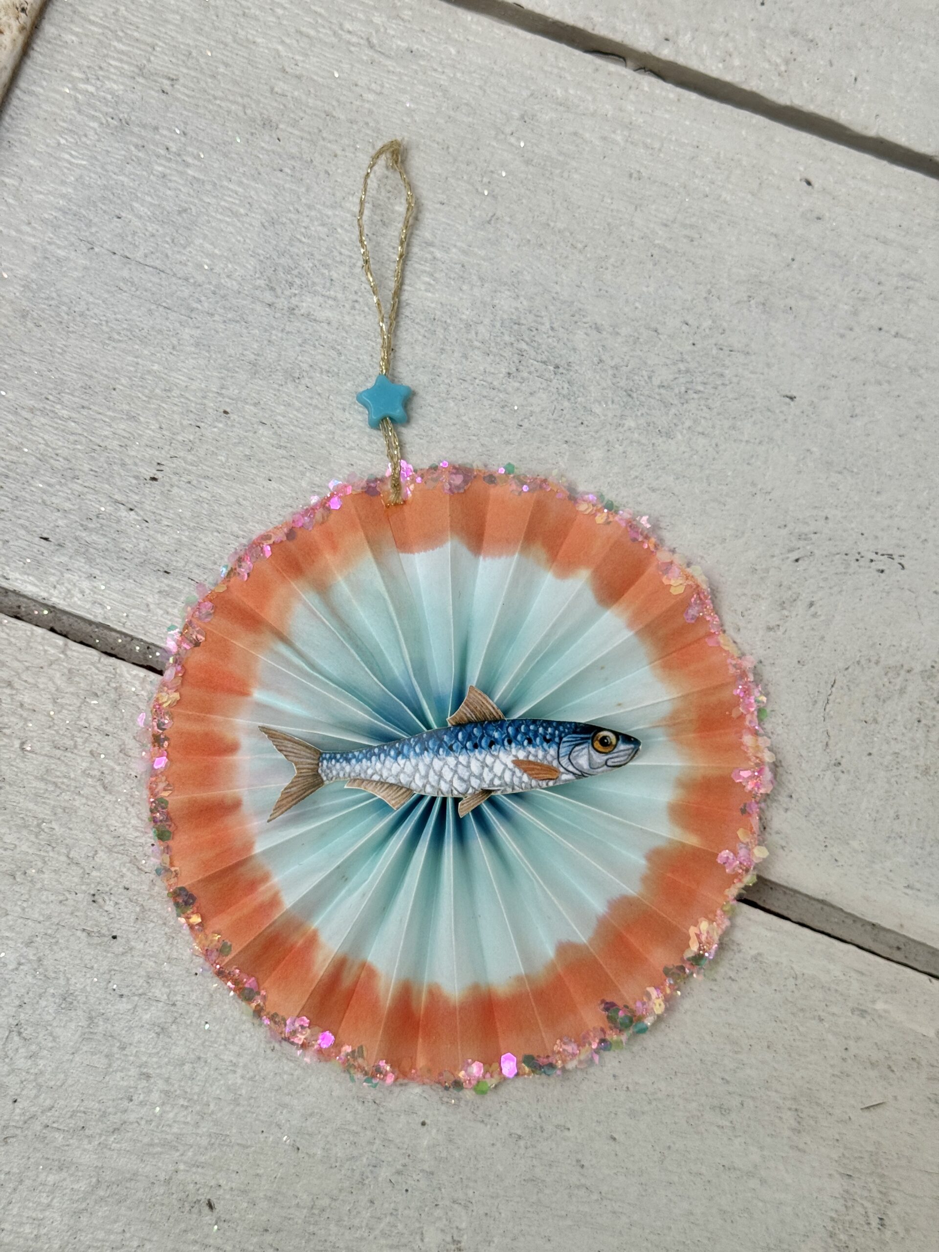 Kanten er dekoreret med glimmer og på guld tråden pynter en plastikperle.