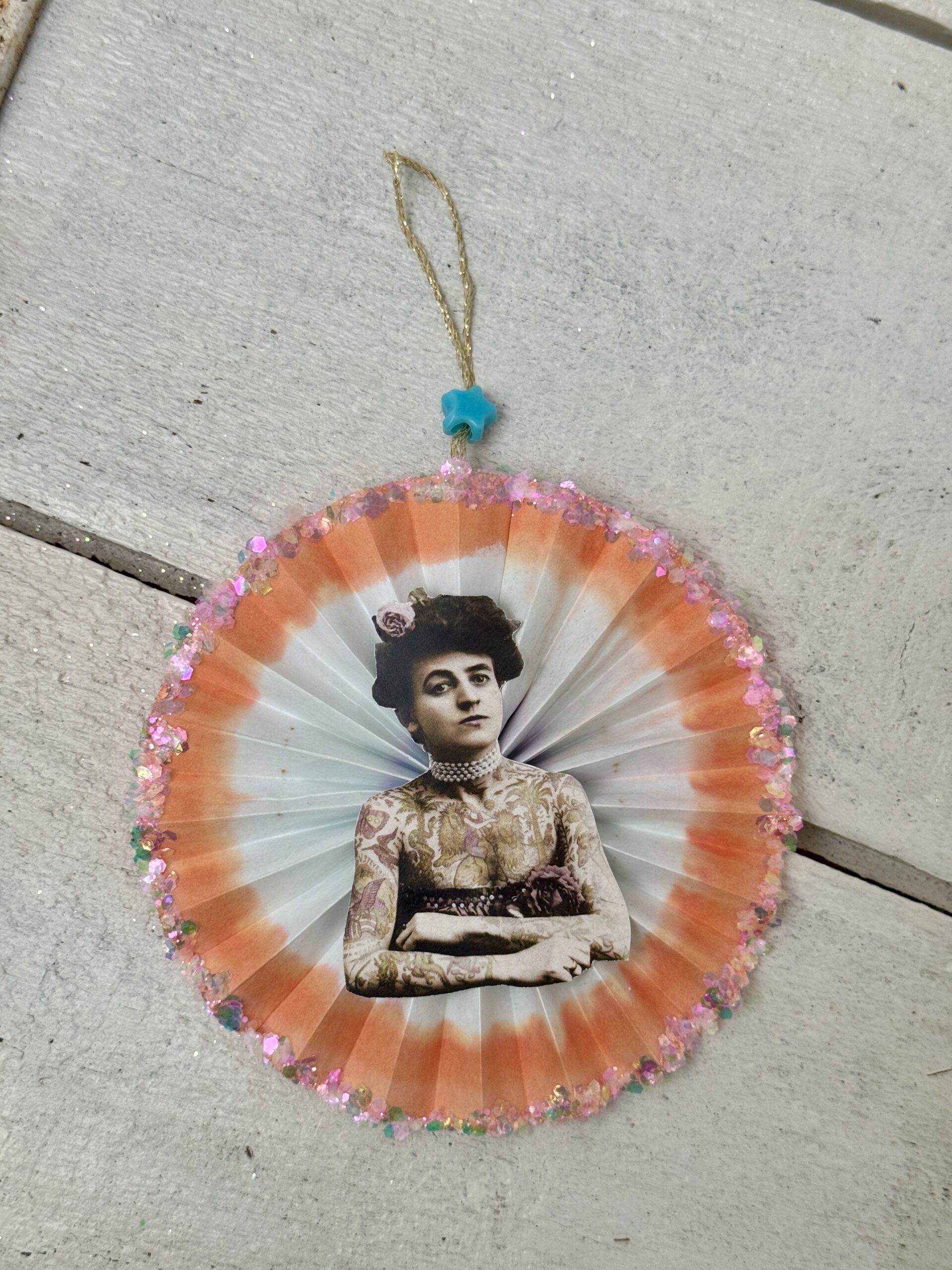 Håndlavet rosette af malet papir og med glansbilleder på begge sider.