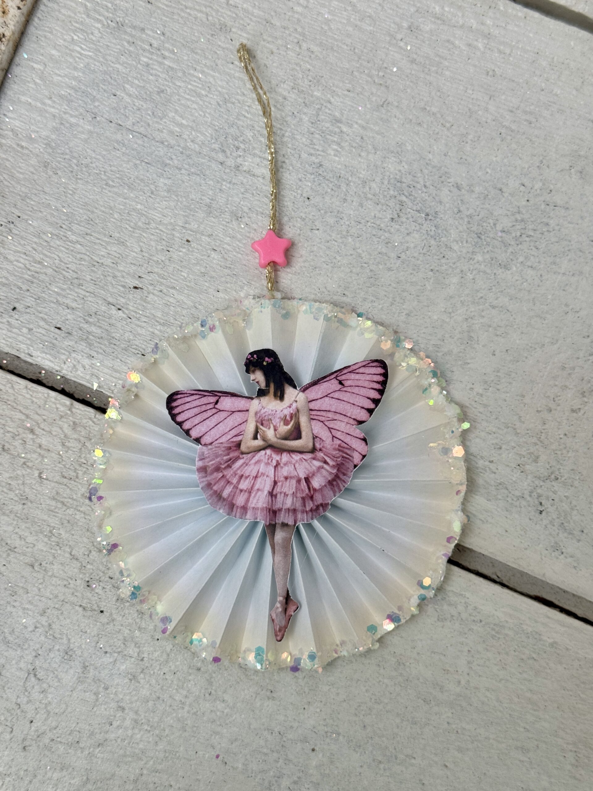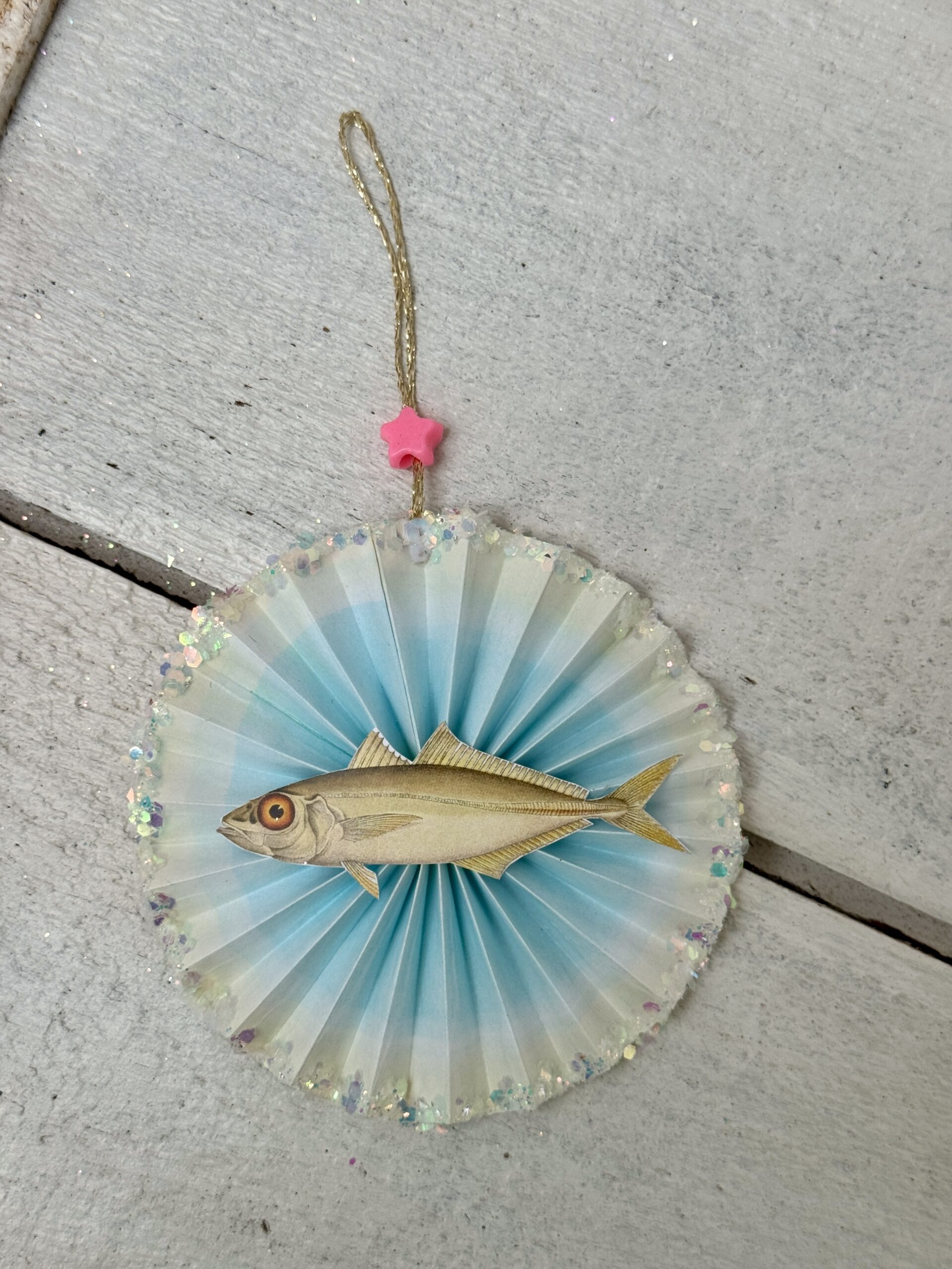 Kanten er dekoreret med glimmer og på guld tråden pynter en plastikperle.