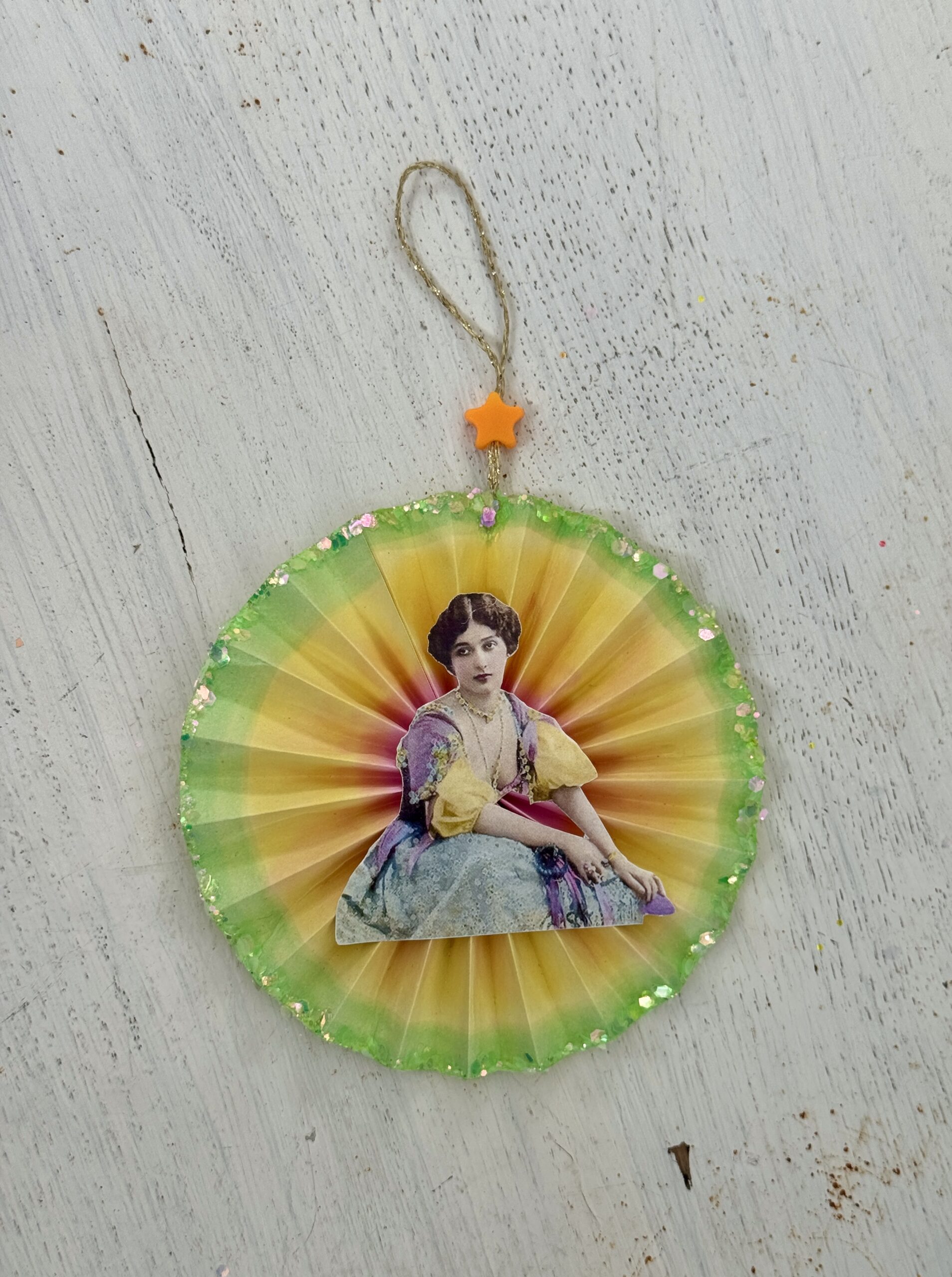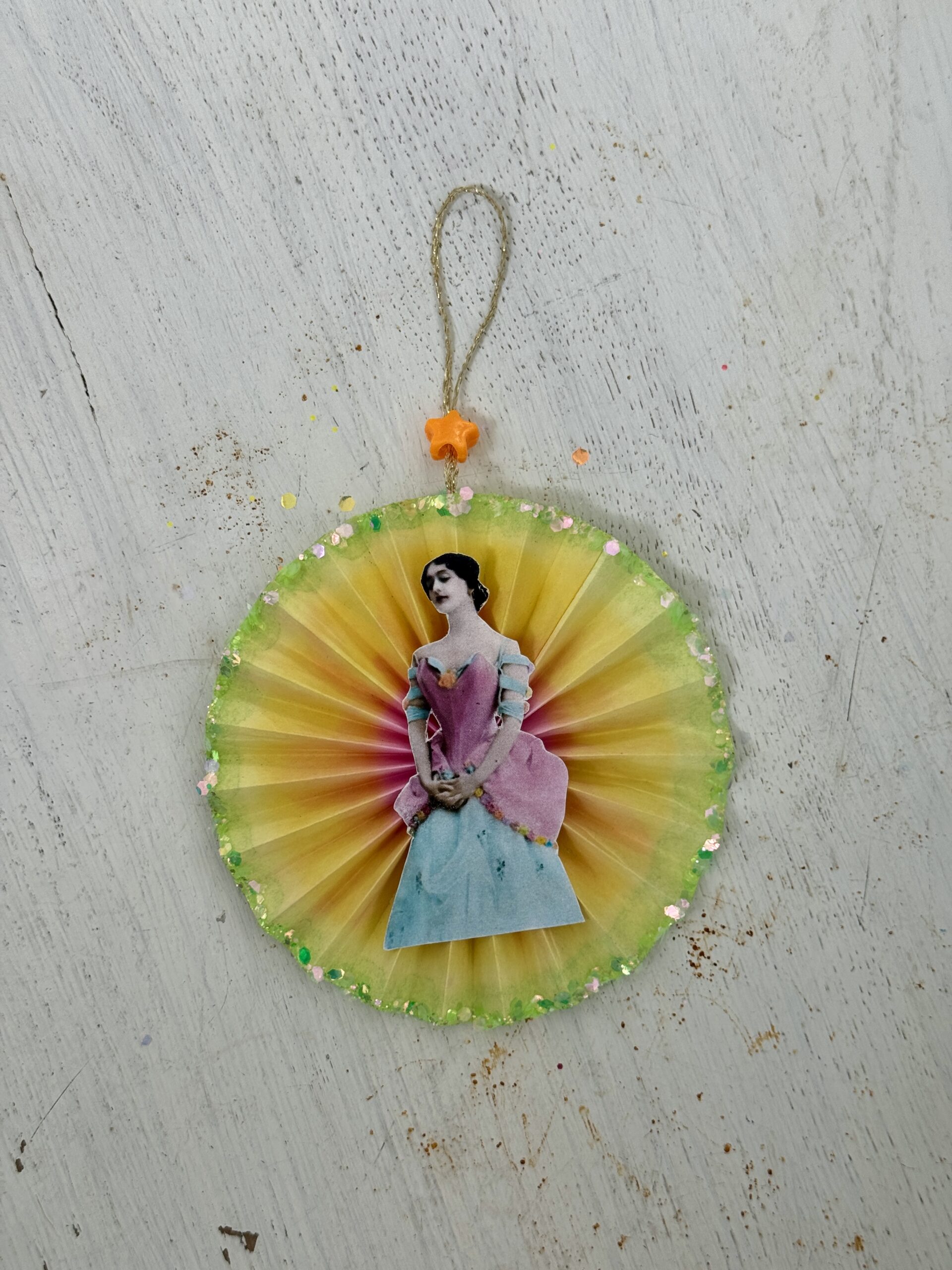 Håndlavet rosette af malet papir og med glansbilleder på begge sider.